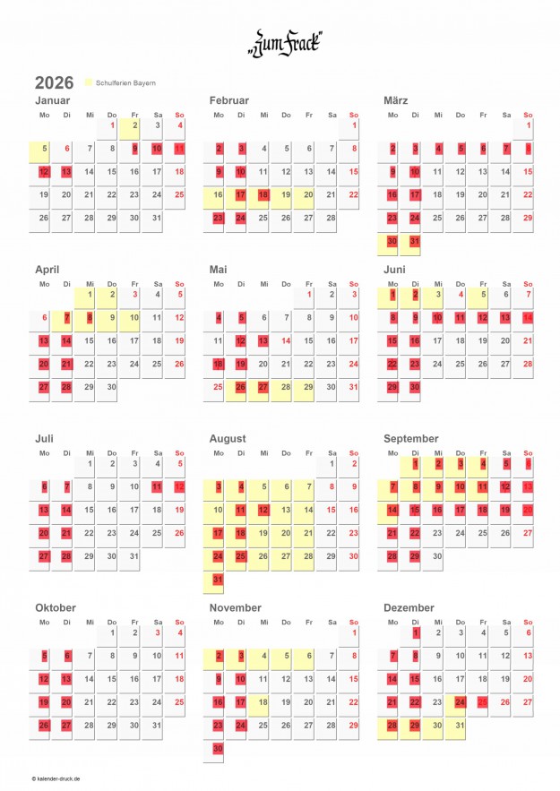 Geöffnete Tage 2026 (rot markiert=geschlossen)